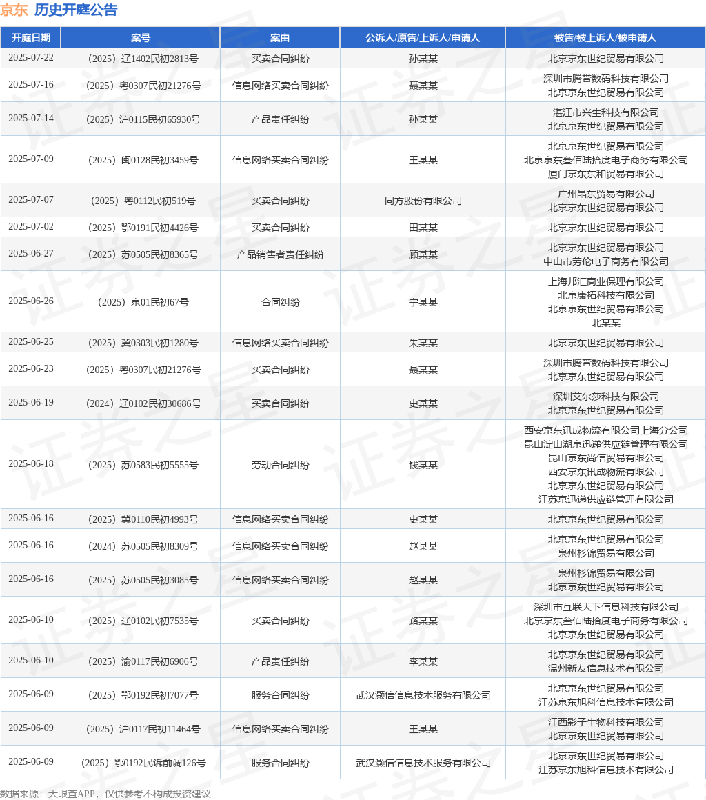 案号:(2024)辽0102民初30686号审理法院:沈阳市和平区人民法院案由:买卖合同纠纷当事人信息: 原告/上诉人:史某某 被告/被上诉人:深圳艾尔莎科技有限公司、北京京东世纪贸易有限公司开庭日期:2025年6月19日根据统计,近一年内以北京京东世纪贸易有限公司为当事人的历史开庭公告有206则,其中案由为“信息网络买卖合同纠纷”的公告以67则居首,其次为“买卖合同纠纷”有37则,“产品责任纠纷”有19则。历史开庭公告(前20条)如下: